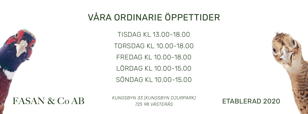 Butiken är belägen i Kungsbyn (mellan Västerås och Enköping). Närmare bestämt vid Kungsbyn djurpark direkt i anslutning till restaurangen & cafét. Fasan & Co AB flyttade hit i september 2020. Och vi stormtrivs med vårt lantliga läge, den friska luften & den stressfria miljön det medför.